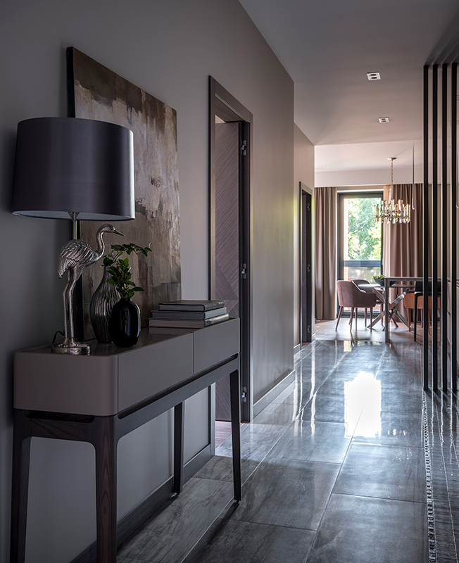 Перепланировка была невозможна: стены были усилены металлическими швеллерами, которые создали несущий контур внутреннего пространства. А поскольку к моему приходу в проект требования к интерьеру у заказчиков поменялись, приходилось встраивать изменения в уже существующие объемы. В итоге квартира вместила в себя две спальни, кабинет, открытую зону кухни-гостиной-столовой, два санузла, в одном из которых обустроена постирочная, и две гардеробные комнаты. Стержнем квартиры стал коридор, в который выходят двери всех помещений.