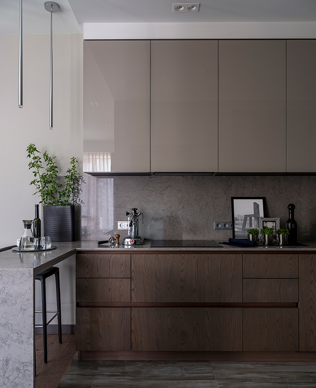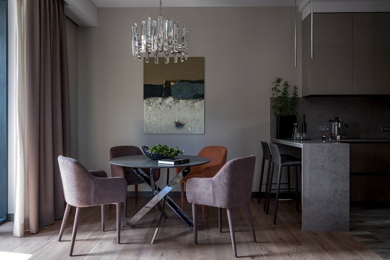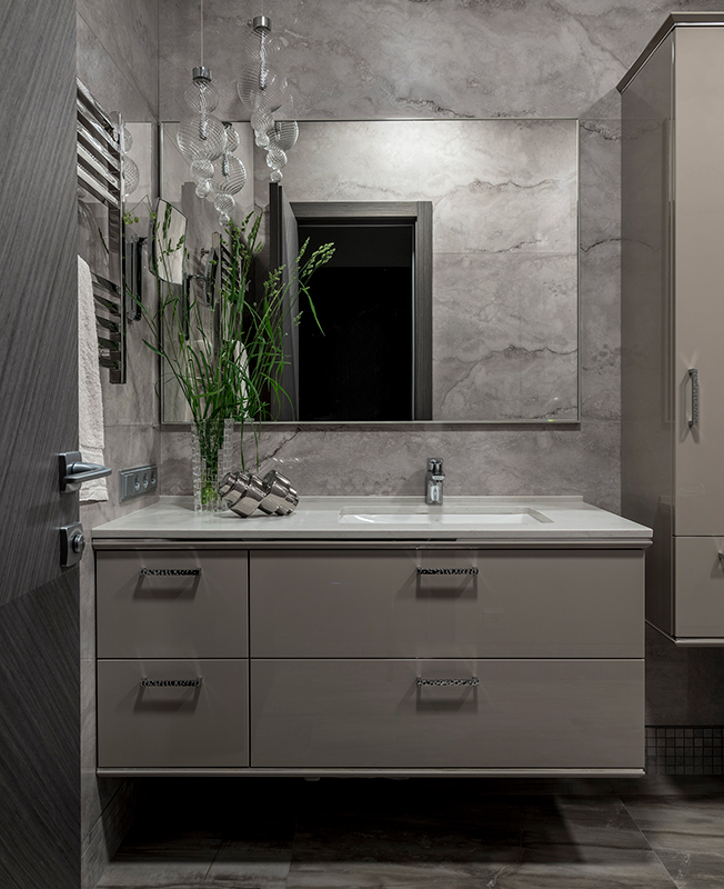 «Заказчики начинали работу над квартирой с другим дизайнером, но когда уже возвели стены, дизайнеру пришлось срочно уехать в другую страну. По совету общих знакомых для дальнейшей работы пригласили меня. Нужно было создать современный интерьер, который отражал бы образ жизни каждого члена семьи и при том не распадался на отдельные зоны, оставаясь семейным домом, в который все мечтают вернуться в конце рабочего дня.