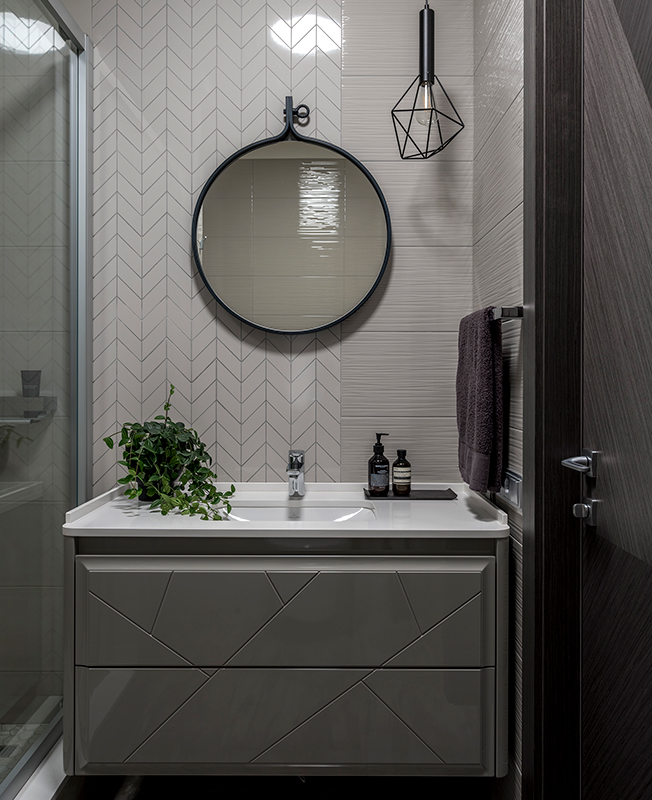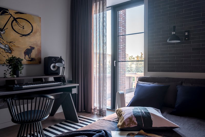 Сын хозяев увлечение музыкой перевел в профессиональную деятельность и пишет композиции для российских и зарубежных исполнителей. Его пожеланием был интерьер с элементами стиля лофт: кирпич за изголовьем, лаконичные светильники, графичный ковер — все работает на создание творческой обстановки. Каждое помещение получилось камерным, с хорошей звукоизоляцией.