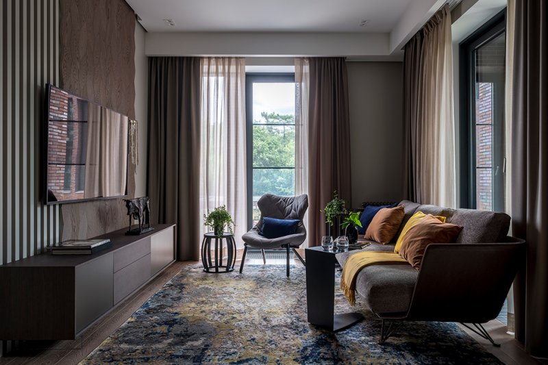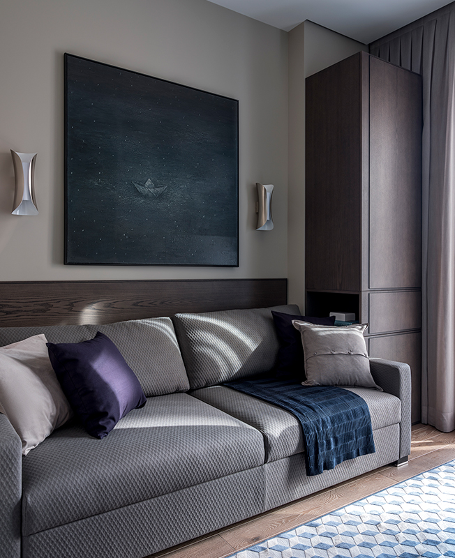 В оформление кабинета я ввела синий цвет, подчеркнув функцию комнаты и дополнив нейтральную гамму, объединяющую всю квартиру. Самым ярким помещением стала зона гостиной с эффектным ковром.