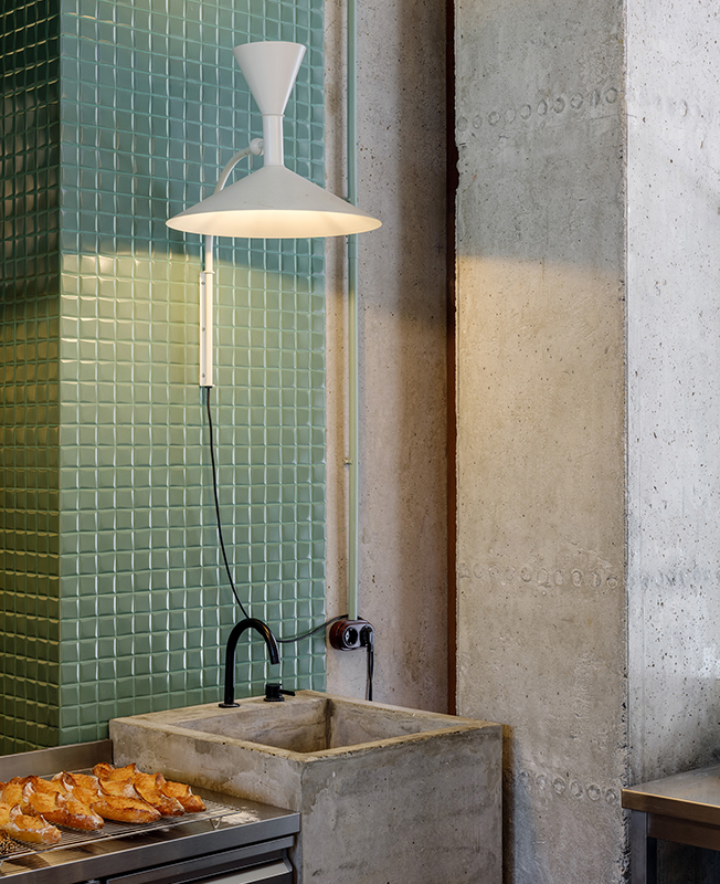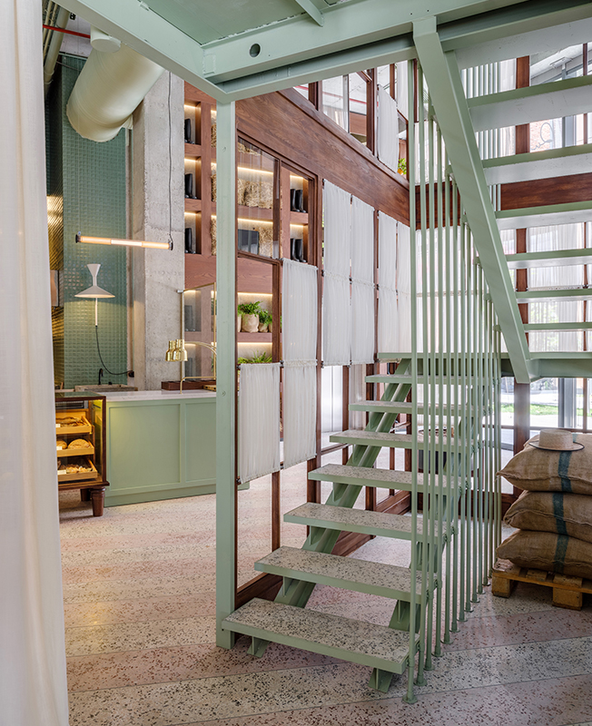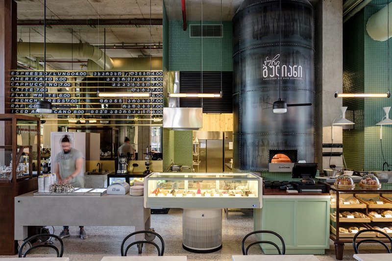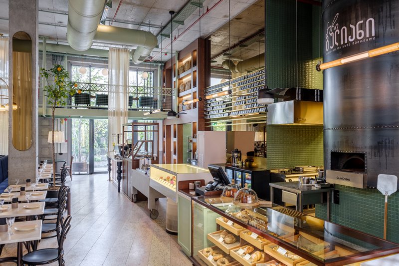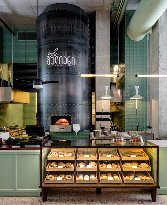 Пекарня площадью 345 кв. метров занимает два уровня. На первом этаже находятся три входные зоны с живописной террасы, главный зал, стойка обслуживания, где главным арт-объектом стала профессиональная кофемашина Slayer, и открытая кухня с витринами от итальянского бренда IFFI, наполненными сладостями. Один из центральных элементов первого этажа — огромная металлическая печь, в которой ежедневно выпекаются хачапури и другая грузинская выпечка, которая находится на виду у гостей. Главная гордость в интерьере — винтовая лестница, своего рода художественная инсталляция, соединяющая первый и второй этажи.