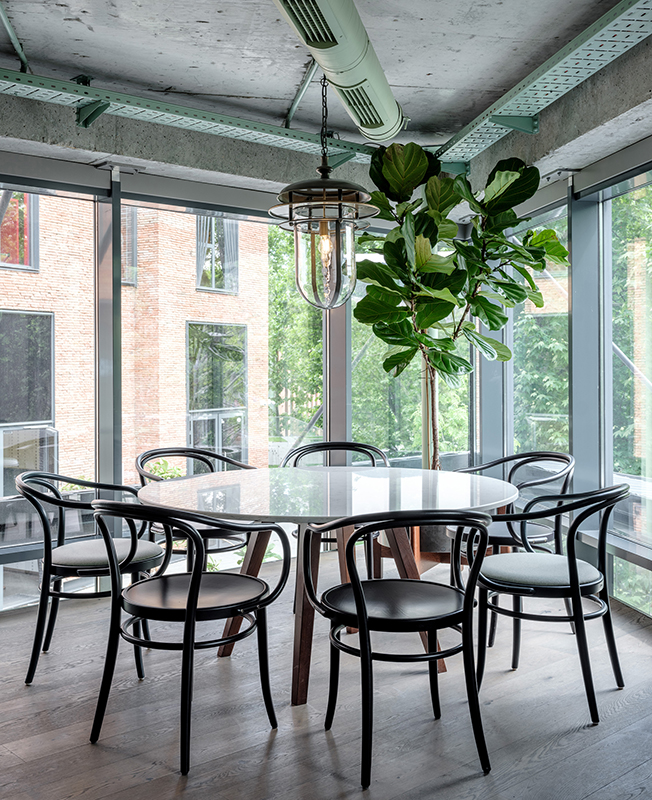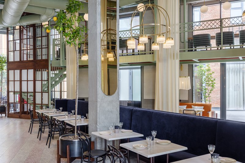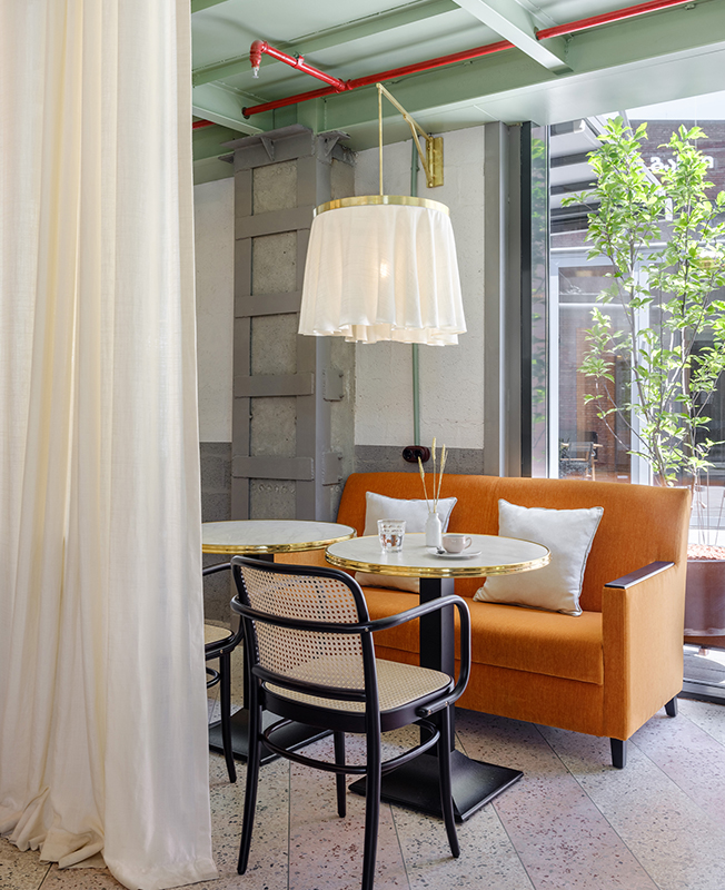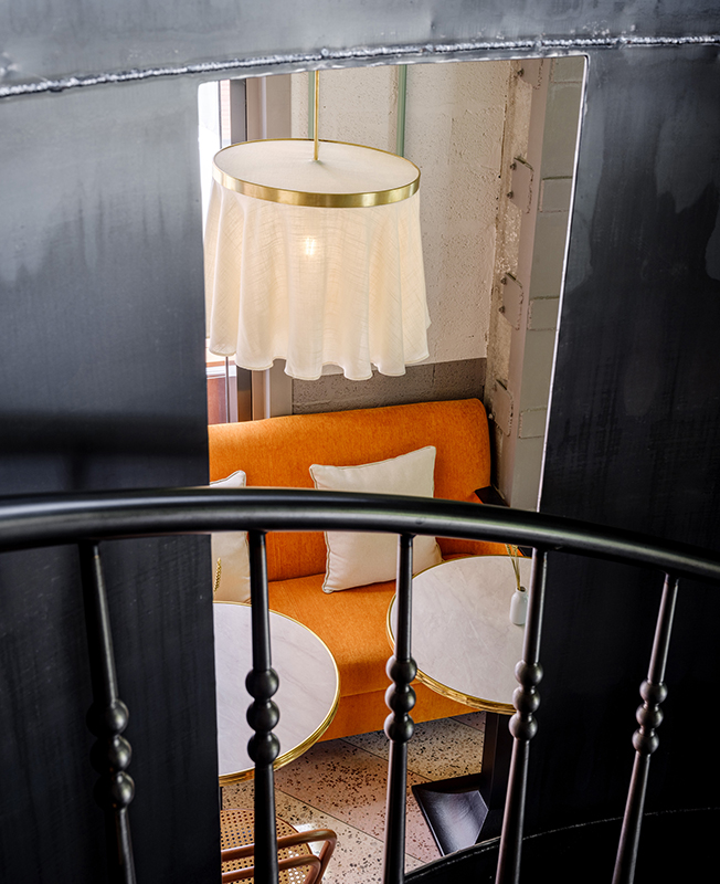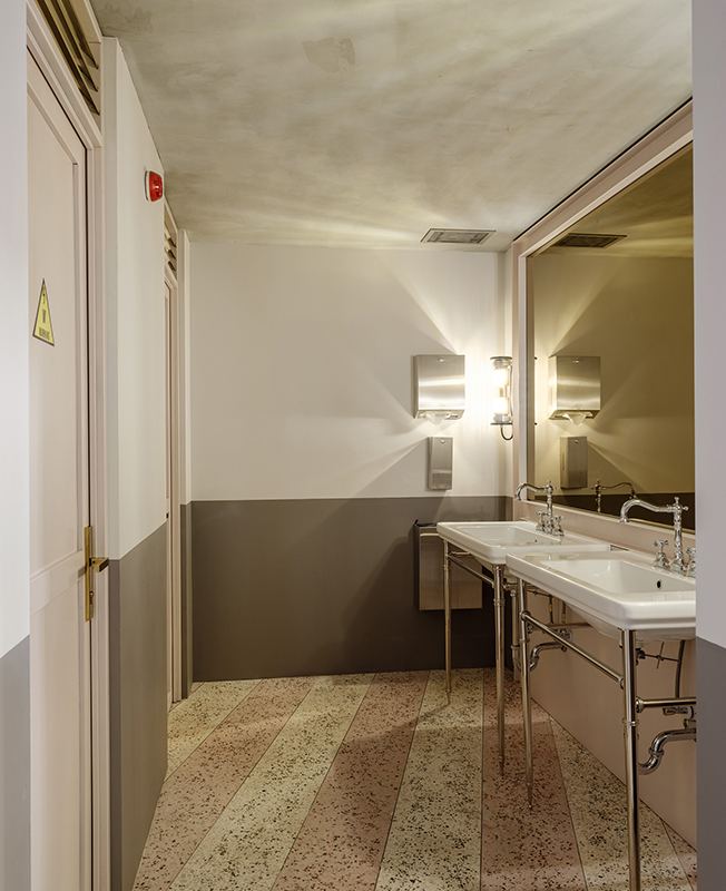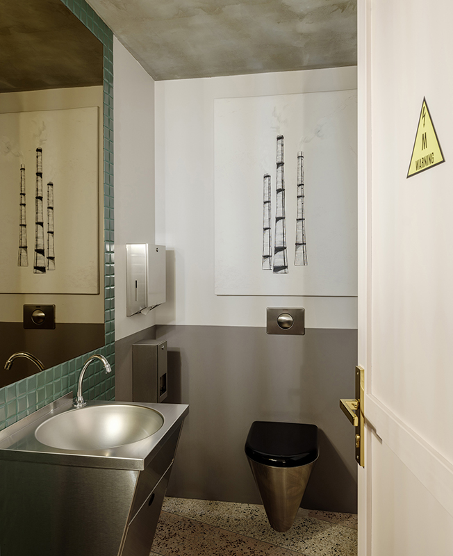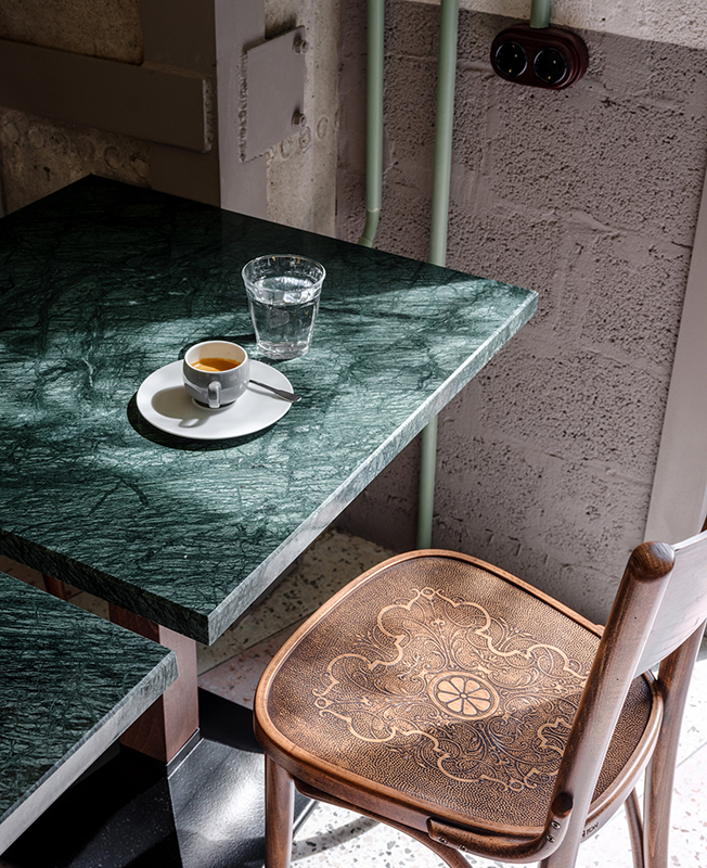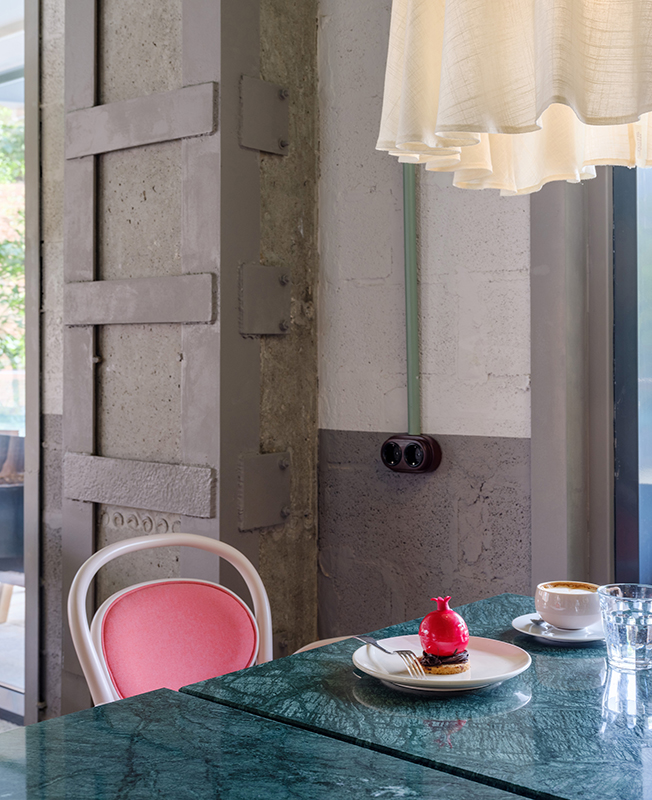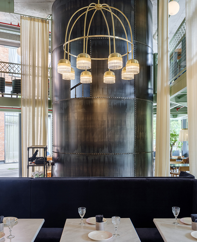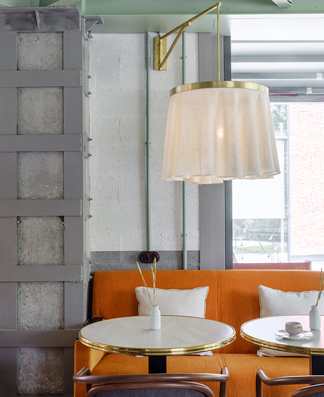 Использовались такие материалы, как терраццо, латунь, мрамор, металл, натуральная древесина, лен и бетон, который, по мнению авторов проекта, придает интерьеру немного брутальности и в то же время выглядит актуально и стильно — в духе современных тенденций.