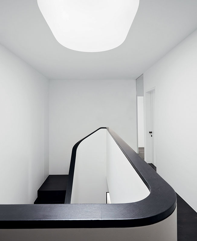 Лестница сменила дислокацию: ее перенесли в центр дома. А чтобы она хорошо освещалась естественным светом, над ней появился световой фонарь. Он стал одним из самых сложных элементов проекта, поскольку его пришлось вставлять в скатную крышу двойной кривизны, покрытую сланцем.
