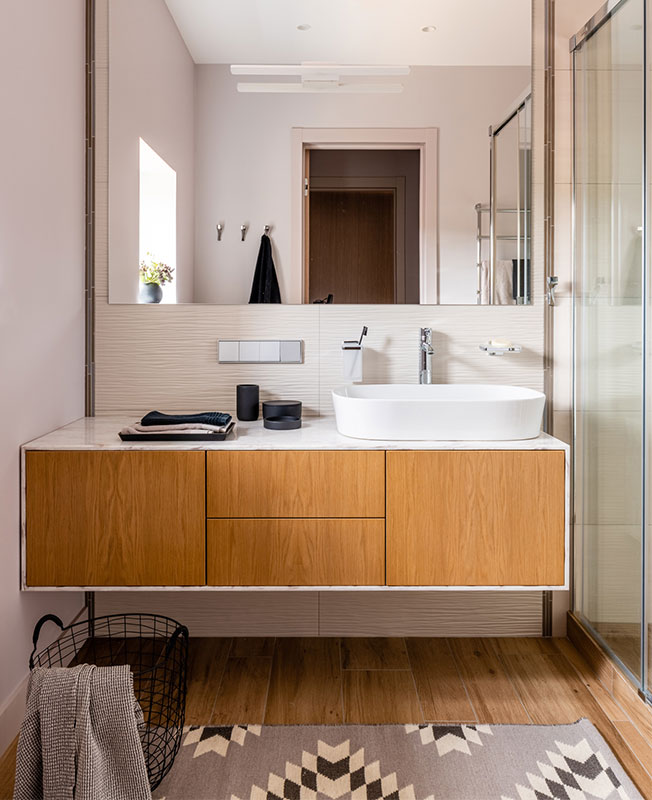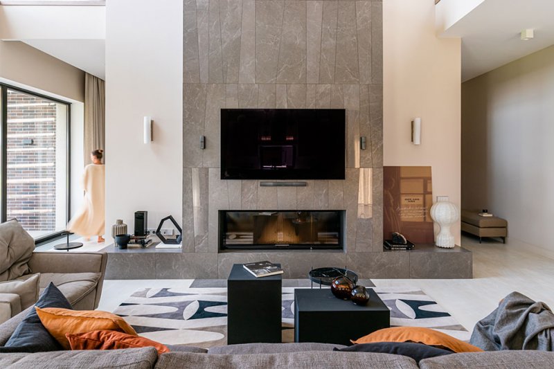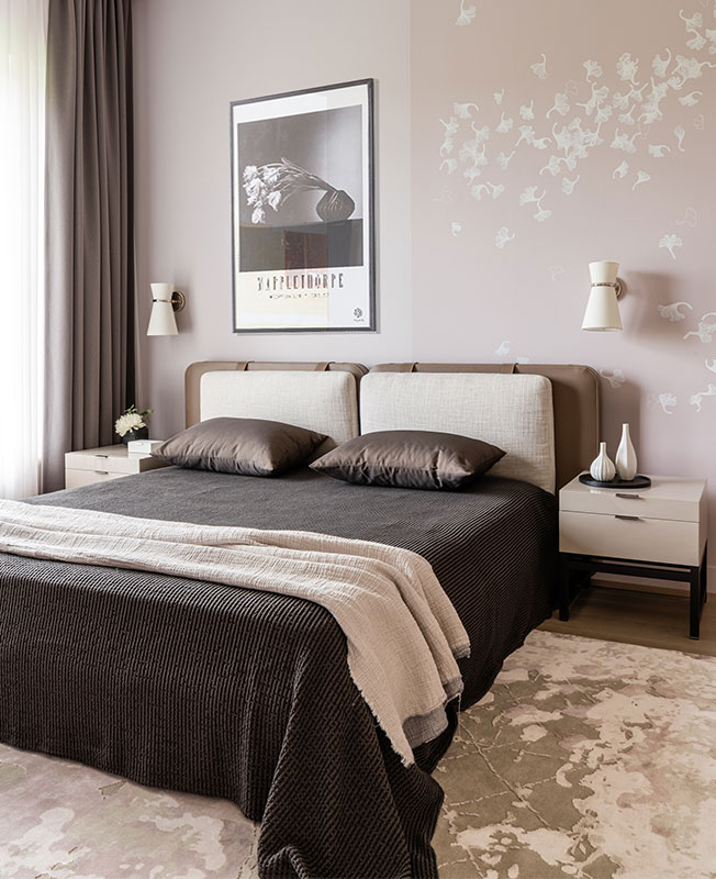 В основе отделки — крупноформатный керамогранит АRCH-SKIN в глянцевом и матовом исполнении. Дополнительно использовали натуральный камень и древесину. В спальнях применили обои ручной работы Fresq, в ванных комнатах — плитку Mutina и Vogue Ceramics.