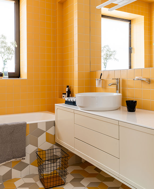 Контрастными цветами выступили кирпичный, апельсиновый, ярко-желтый в детской ванной и насыщенный синий в кабинете. Избежать монотонности помогли материалы разных текстур — керамика, стекло, дерево, камень, а также фактурные ткани.