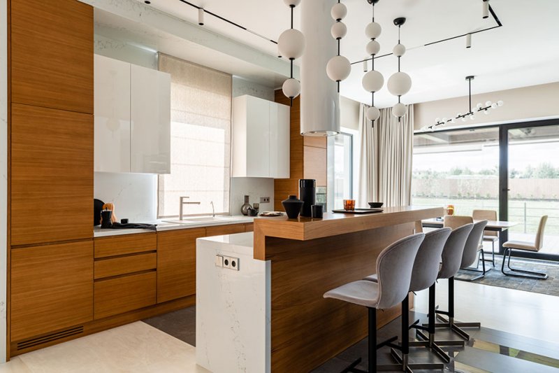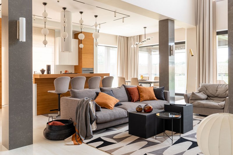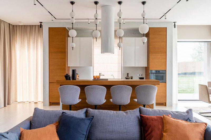 Основа внутреннего пространства дома — функциональная двухсветная гостиная, которая объединена со столовой и кухней. Слияние этих двух зон неслучайно — заказчики хотели, чтобы гости могли общаться: вместе готовить за барной стойкой, коротать вечера на веранде, смотреть на играющих перед камином детей. Панорамные окна в гостиной открываются в сад — летом это позволяет увеличивать площадь.