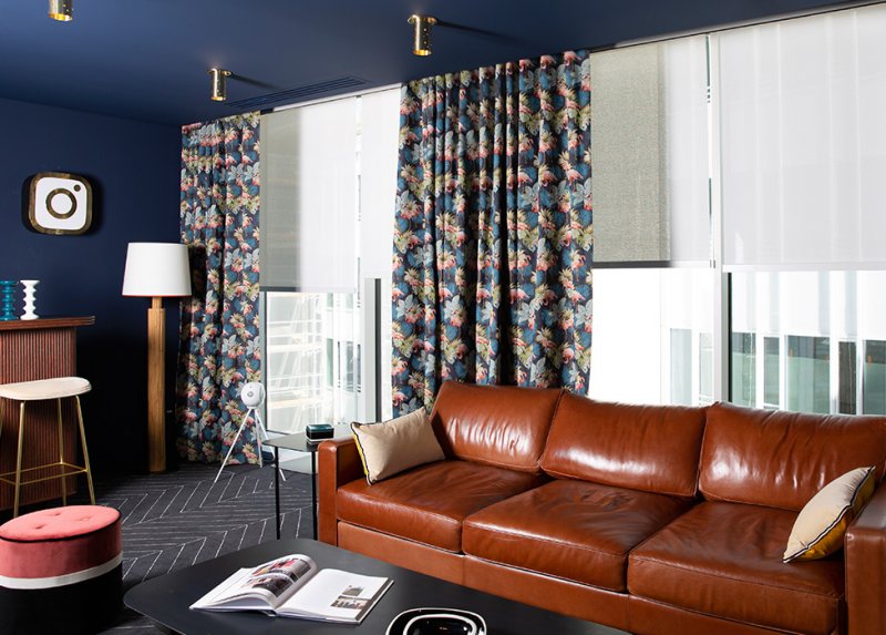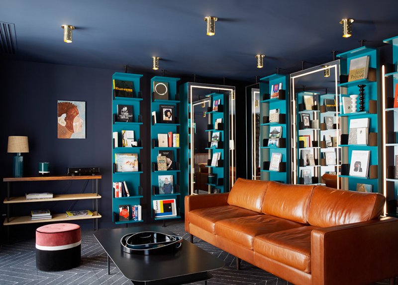 Интенсивный бродвейский синий украшает стены. В зоне гостиной, отделанной натуральными материалами, такими как дерево, металл, бархат и кожа, солируют яркие предметы мебели — яркое красное кресло Martine и пуф Leo Bleu Sarah.