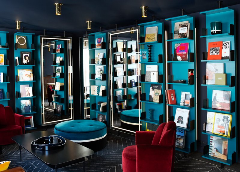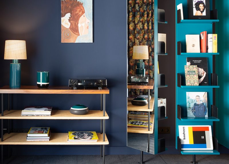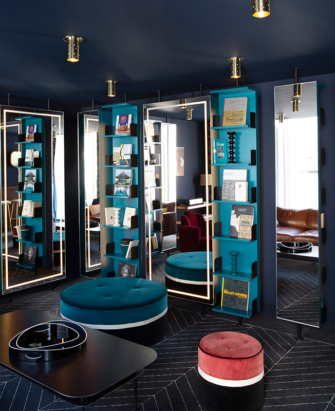 Благодаря ковру с геометричным рисунком паркетного шеврона и вращающимся зеркальным полкам, отражающим оттенки глубоких цветов, Сара Лавуан умело увеличивает пространство.