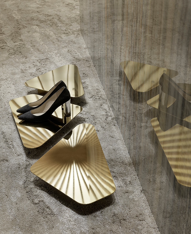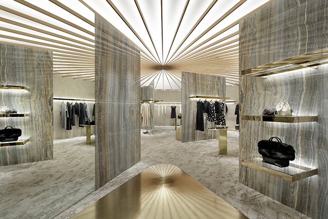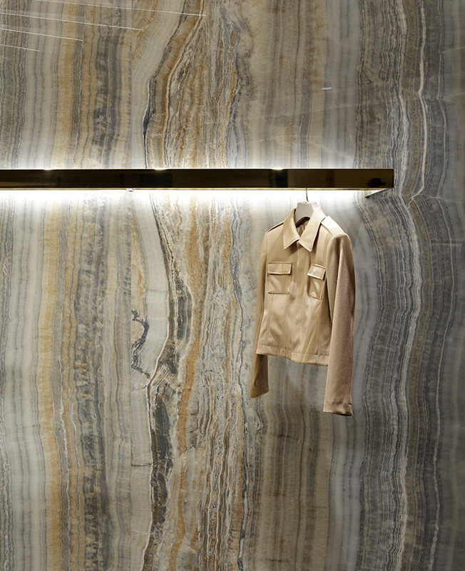 Цвет коллекций прекрасно сочетается со сложной текстурой выбранного камня и мягкими тонами. В интерьере сделан акцент только на металлических деталях: столах, витринах. Тонкий баланс между графикой и мягким светом создает идеальную атмосферу для покупки.