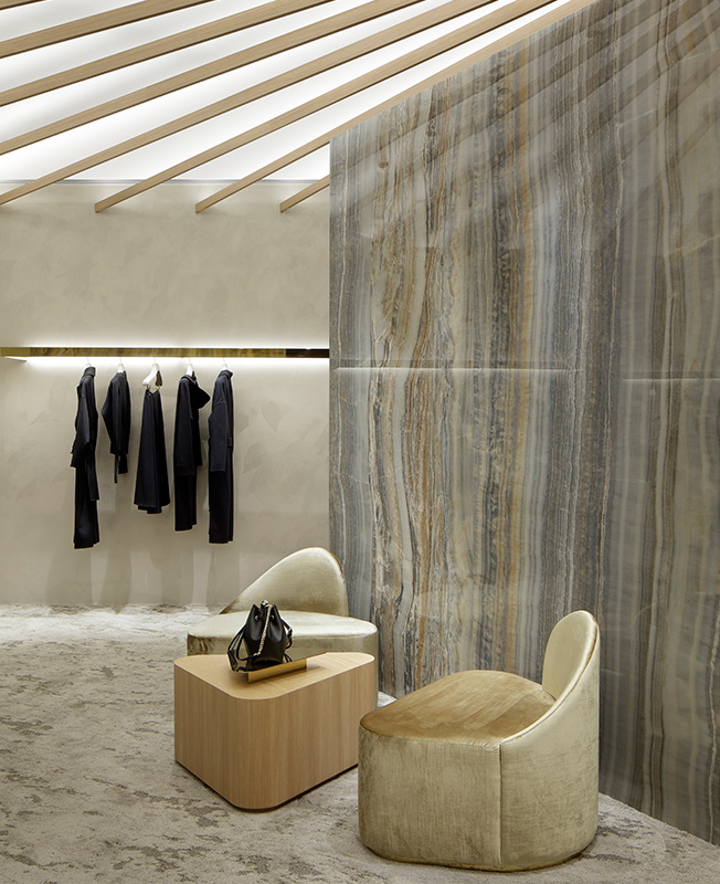 В центре можно увидеть множество коллекций: посетитель визуально привлечен театральным потолком. Его особенность — уникальная система освещения, которая обвалакивает весь интерьер мягким и теплым светом. Проект построен вокруг простой палитры материалов, оттенков мягких серых текстур, контрастирующих с вертикальными каменными перегородками.