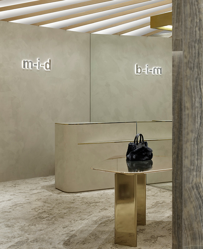 Для концепт-стора M-I-D нужен был дизайн, требующий четкой идентификации для разных брендов. Планировка в форме звезды создает уникальную конфигурацию, которая позволяет осуществлять доступ и вход в магазин из нескольких частей универмага.
