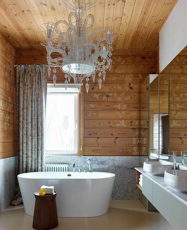 Ванная комната. Люстра Forestier. Стены в отделке натуральным мрамором.