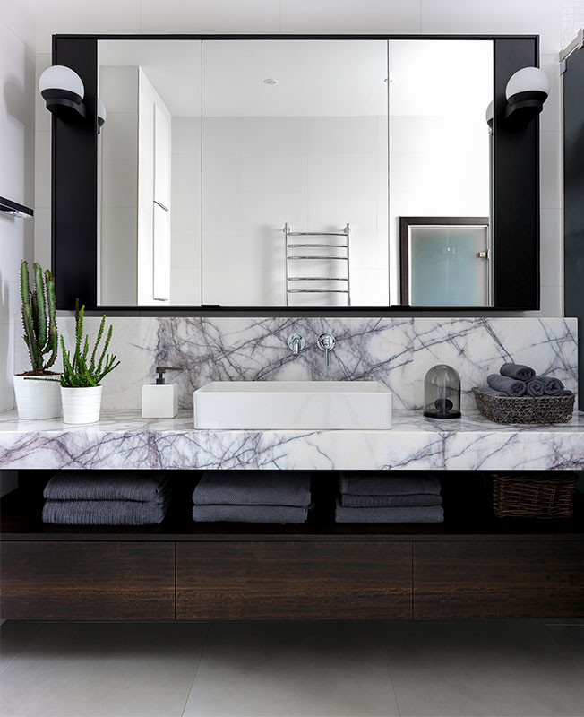 Ванная комната. Мебель изготовлена на заказ по эскизам авторов проекта. Стены в отделке натуральным мрамором.