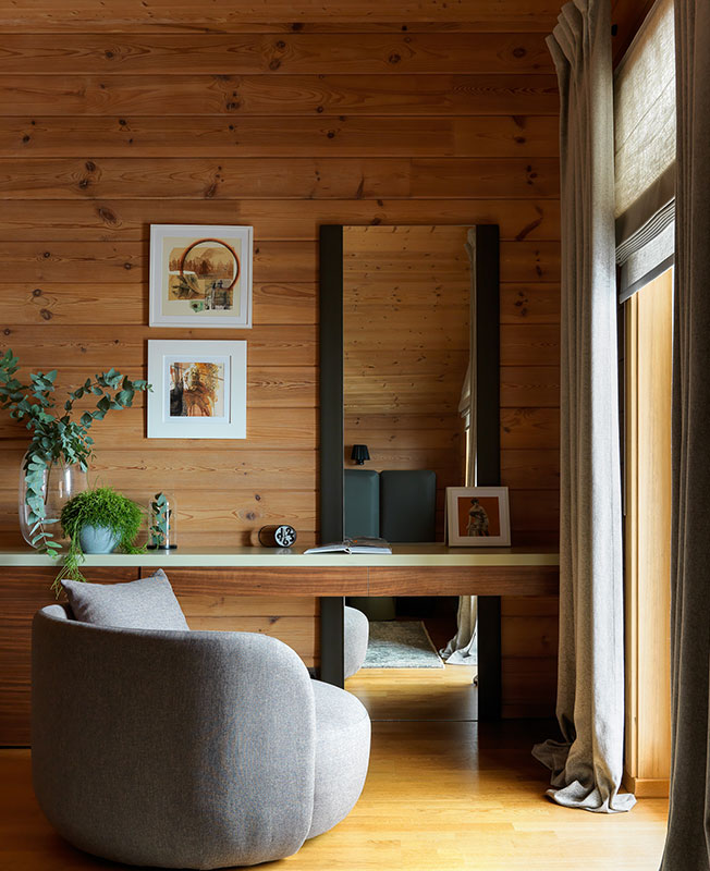 Для одной из стены Ангелина и Ксения предложили сложную мраморную отделку модного зеленого оттенка. Красивым акцентом стала и древесина эвкалипта, которая по контрасту смотрится на общем нейтральном фоне стен. Прекрасный элемент загородной жизни — камин подчеркнули керамической плиткой ручной работы (автор — местный мастер Олеся Лукашенко).