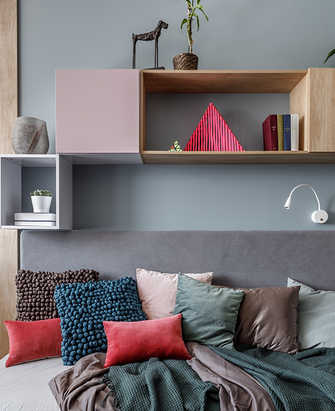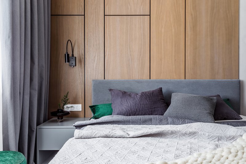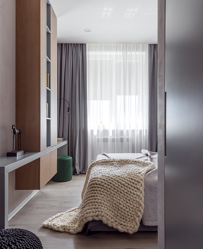 «Спальня умиротворенная, сочетание дерева, текстиля и зеленых акцентов создает особое настроение, — говорят авторы проекта. — Детская будущего архитектора — яркая, насыщенная, наполненная энергией. Стены окрашены: цвет легко будет изменить и трансформировать пространство малыми усилиями — ведь детская должная расти вместе с ребенком».