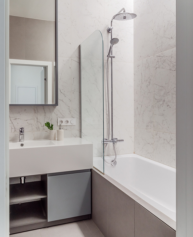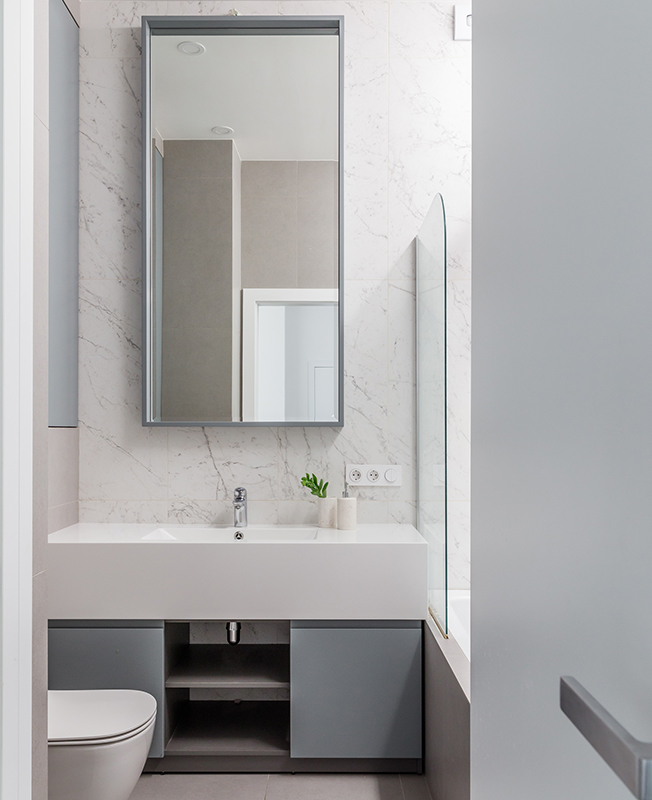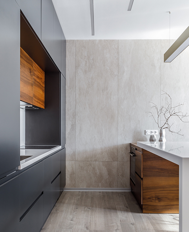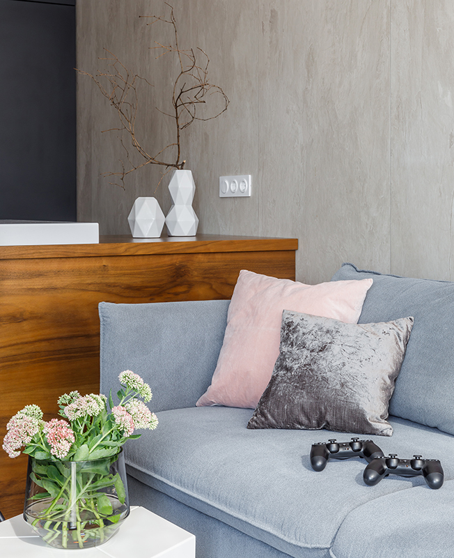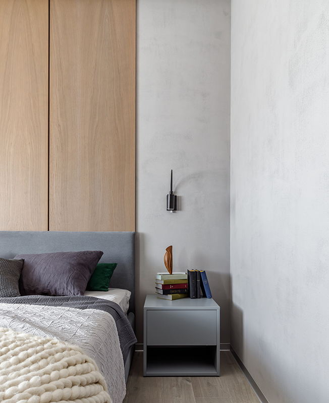 Заказчики успели пожить в самых разных интерьерах и в этот раз хотели видеть квартиру лаконичной по стилю. Отсюда выбор палитры: по запросу хозяев использовали бежевый, серый и белый цвета. Для отделки выбрали природные материалы и их имитации, такие как крупноформатный керамогранит с рисунком под камень. В ванной комнате применили комбинацию мрамора и цемента. Нейтральный фон позволяет менять впечатление от пространства с помощью аксессуаров и декора.