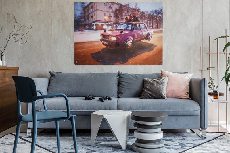 Центром квартиры стала кухня-гостиная. Гости любят собираться за большой барной стойкой, которая отделяет зону приготовления пищи от зоны отдыха, где нашлось место для дивана и «парящей» конструкции, напоминающей камин. Изменить настроение комнаты позволяет подсветка.