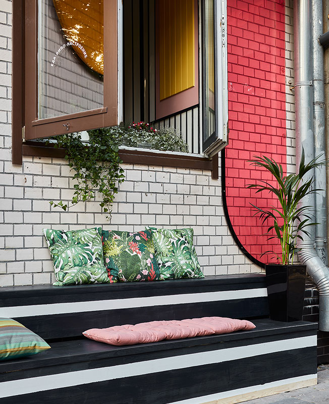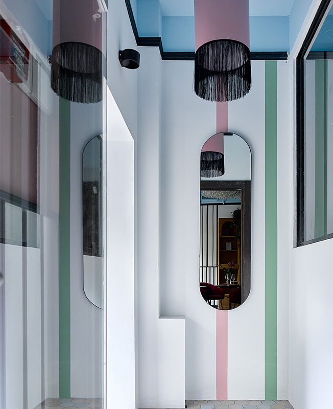 Первый зал — светлое, яркое помещение. В основе палитры — сочный желтый и пудровый розовый с контрастной черно-белой графикой. Оконные откосы также выкрасили в жизнерадостный цвет спелого манго, чтобы даже в московском климате создавалось впечатление, что зал постоянно залит солнечным светом. Краски для стен выбрали от Little Greene, напольная плитка — Kerama Marazzi.