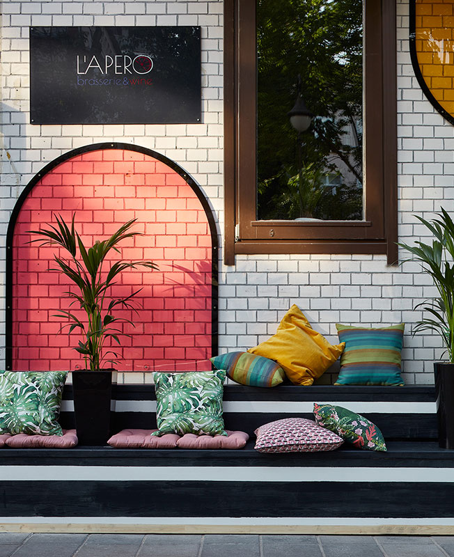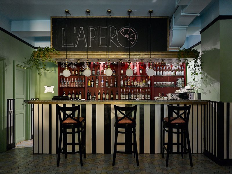 Перед дизайнером стояла задача создать жизнерадостное современное пространство в духе парижских кафе, т.к. кухня основана на французских традициях. В переводе с французского l’apero означает «аперетив», который после рабочего дня в компании друзей может плавно перейти в ужин.
