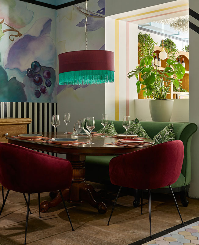 Второй зал получился более камерным, спокойным. Цвета сдержанные и глубокие — зеленый, бордо, охра. Все оттенки интерьера объединила роспись в виде виноградной лозы (Максим Поторжнов). Немаловажным элементом интерьера стали многочисленные растения, создающие умиротворяющую атмосферу, располагающую к отдыху.