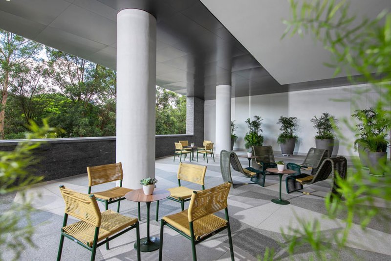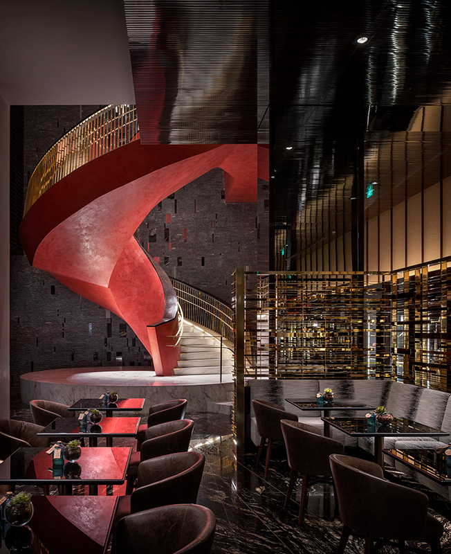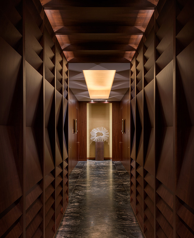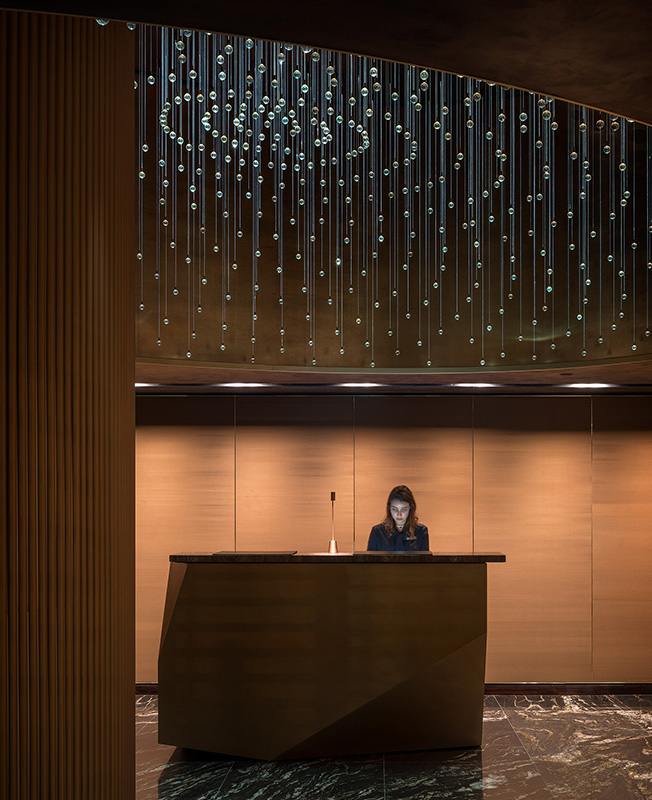 Зал и помещения для мероприятий на верхнем уровне выглядят как павильоны с видом на парк. Они декорированы панелями из тропического дерева и нестандартными скульптурными светильниками. Открытые террасы связывают пространство для мероприятий с панорамой города, уходящей за горизонтом.