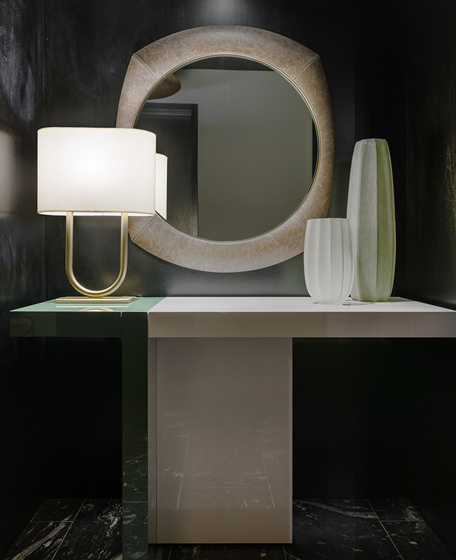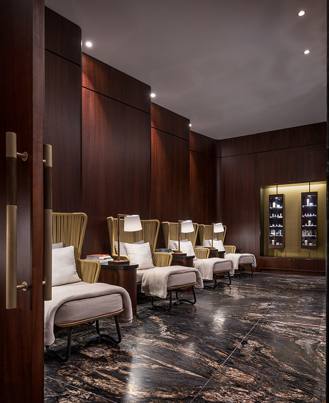 Зона спа украшена бразильским зеленым мрамором. Покрытие из бананового волокна ручной работы от Нани Кинелатто добавляет изысканную простоватую текстуру, контрастируя с полированной латунью и матовой фурнитурой.
