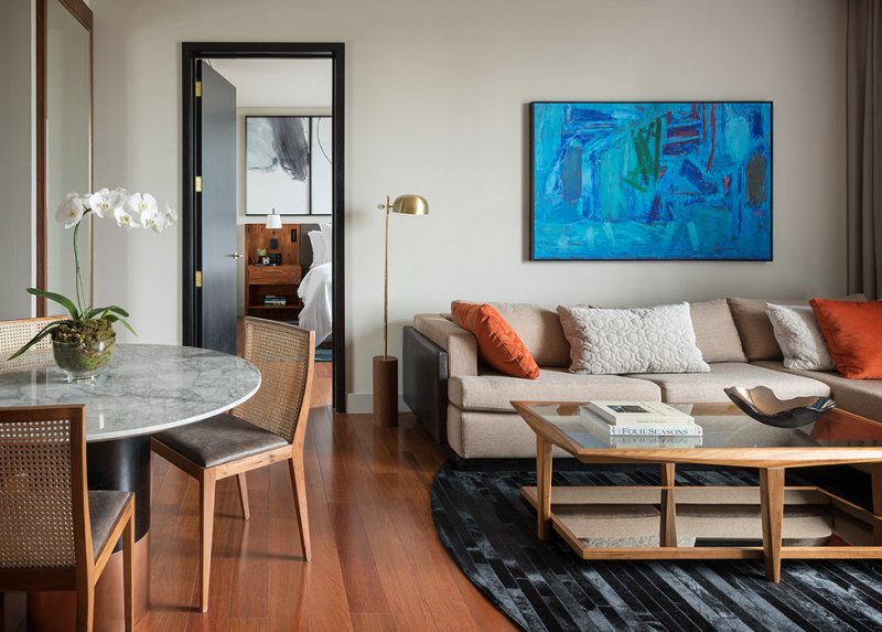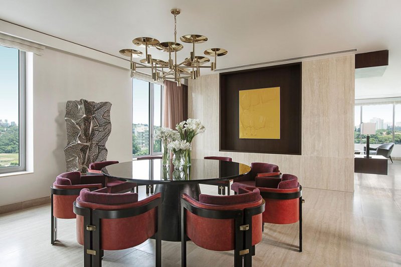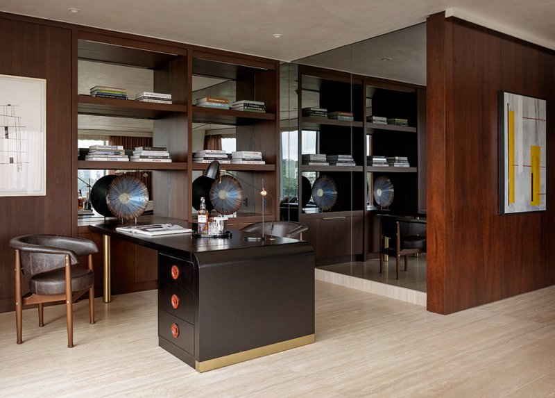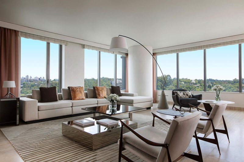 Пространство имеет почти бруталистическую простоту, оно чисто и архитектурно, но очень роскошно. Повсеместное использование травертина, бразильского бороздчатого дерева, темного тона и светлой штукатурки создает фон для дизайна с яркими цветами и культовой бразильской мебелью от Хорхе Залзупина. Произведения искусства и скульптуры бразильских художников завершают произведение.