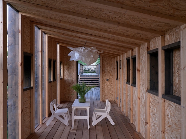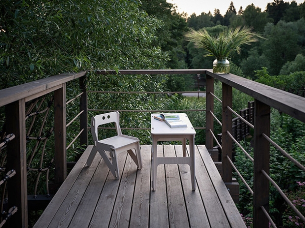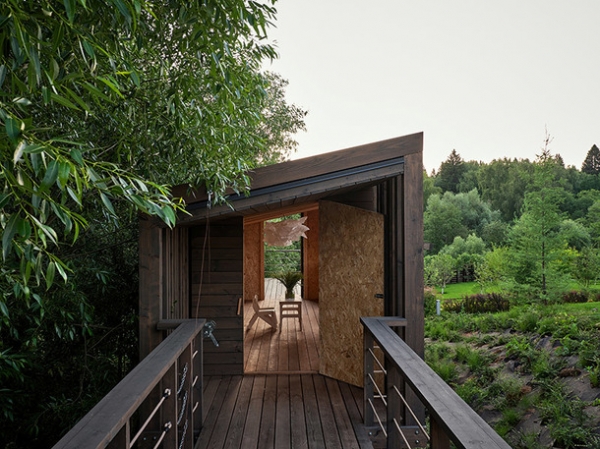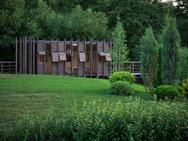 Также на сложном террасированном участке необходимо было расположить баню, барбекю, гараж и детский домик. При этом заказчики также хотели, чтобы дизайнеры максимально задействовали всю полезную площадь участка. "Заказчик, например, очень расстраивался, что часть участка, представляющая из себя почти отвесный склон, никак не используется: там невозможно было ни ходить, ни что-то сажать, — рассказывают авторы проекта. — Так появился детский домик на сваях, который как мост соединил два разных уровня участка, а под ним появилось отличное пространство для детской площадки с гамаком, "тарзанками" и с сетками для того, чтобы лазить".