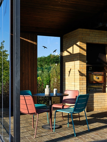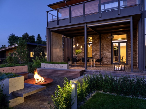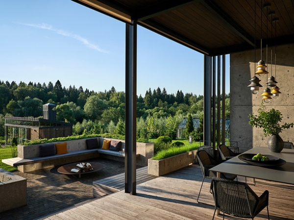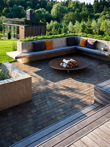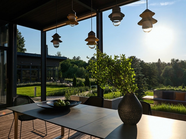 У заказчиков было четкое понимание того, что им нужно. Они хотели комфортную среду для отдыха с детьми и для приема гостей: например, крытую террасу, чтобы дождь и плохая погода не помешали бы проводить время на открытом воздухе. Также необходимо было продумать и открытую террасу для погожих дней. Заказчики не хотели, чтобы каминная зона была только внутри дома, на улице дизайнеры также обустроили очаг, у которого можно уютно сидеть по вечерам.