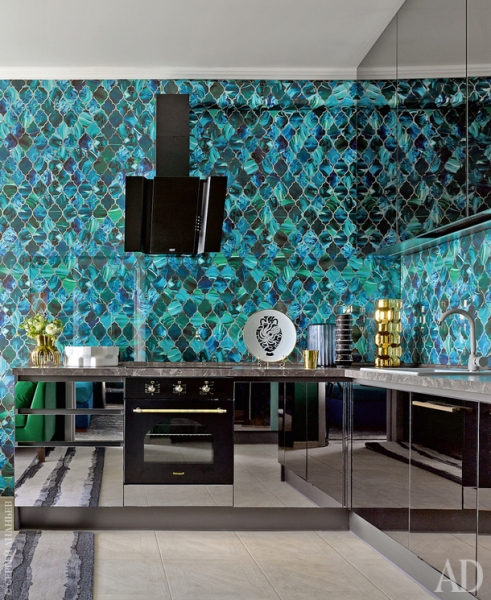 Давняя подруга дизайнера Яны Светловой попросила ее оформить квартиру в Санкт-Петербурге так, чтобы жилище с порога вызывало смесь восторга и изумления. Роскошные бирюзовые обои из своей коллекции Яна сбалансировала минималистичным кухонным гарнитуром с фасадами из темного зеркала, а общую картину завершили золотистые вазы.