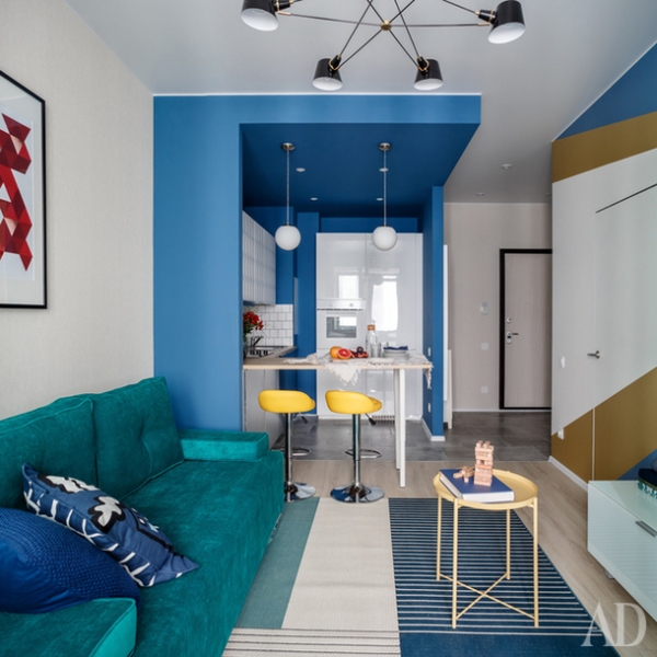 Дизайнеры Марина Новикова и Ольга Луис такую яркую кухню сделали в квартире под аренду. Кухня здесь объединена с гостиной, но не совсем: зона готовки вынесена в отдельный объем, который выделен с помощью цвета и понижения потолка. Для быстрого перекуса предназначена барная стойка, а в гардеробной спрятан раскладной стол на случай компании друзей.