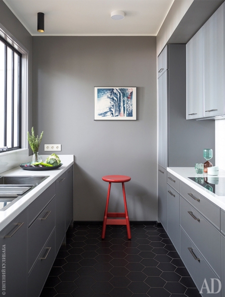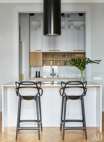 Дизайнеры Евгения Шилова и Илья Ерошевич из бюро Design Rocks в двухуровневой квартире в Москве под кухню выделили часть помещения с нишей. Глубокие шкафы оказались неудобными, их решили утопить в стену. Благодаря этому получилась функциональная ниша, где находится вся техника. Небольшой остров визуально завершает зону кухни, в этом интерьере он играет только роль барной стойки для завтрака или ужина — никакой техники в нем нет.
