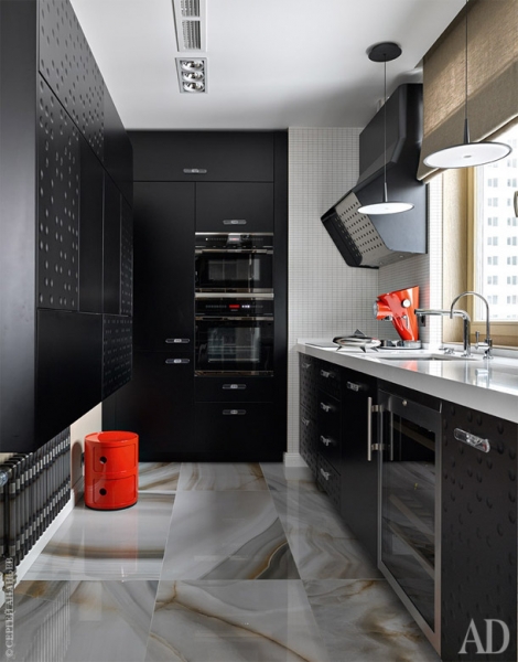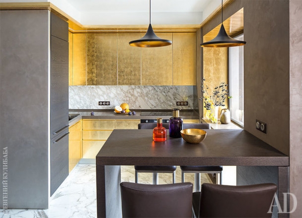 На золотую кухню дизайнера Эльвиру Станкевич вдохновил один из проектов Жана-Луи Денио. Хозяйка квартиры в основном живет за границей, в Москву приезжает на несколько дней в месяц, поэтому такая смелая кухня не надоест ей и не начнет раздражать. На золотых фасадах дизайнер решила не останавливаться, золотом покрыли также потолочные карнизы и оконные откосы, а сбалансировали тяжелый люкс мраморный фартук и пол.
