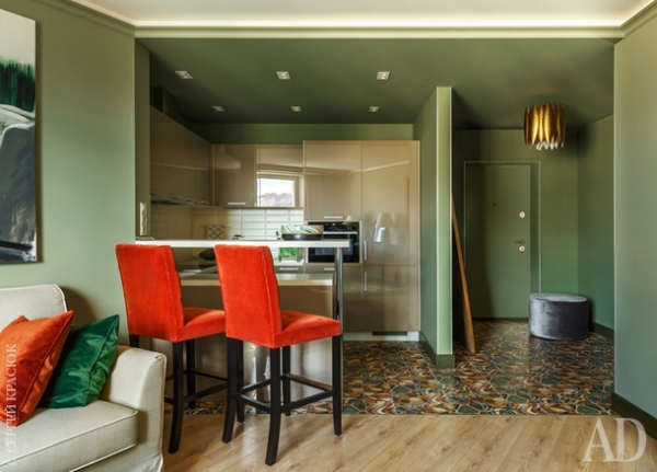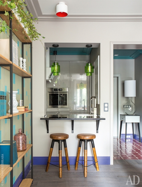 А в этой московской квартире потолки всего 2,3 м, но это незаметно благодаря хитрому приему: потолки дизайнер Екатерина Попова выкрасила в тот же цвет, что и стены, а яркие барные стулья забрали на себя львиную долю внимания. Барная стойка здесь двухуровневая, со стороны кухни столешница выполняет роль сервировочной зоны, а гости сидят с противоположной стороны — там, где столешница поднимается.