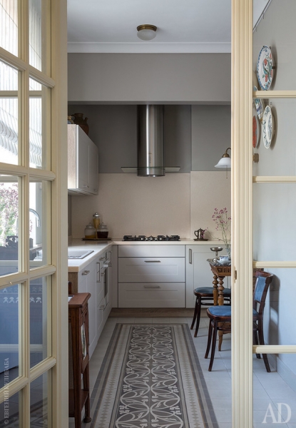 Дизайнер Елена Зуфарова сделала этот интерьер для своей старой знакомой, обладательницы большой коллекции антиквариата. Она хотела кухню, объединенную с гостиной, но, зная, что хозяйка очень любит собирать дома гостей и много готовит, предложила компромисс — оставить перегородки, но сделать их стеклянными.
