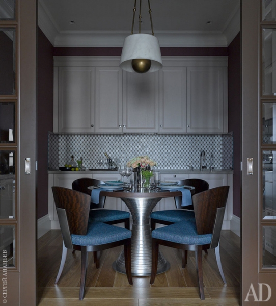 Заказчики дизайнера Марии Мироненко попросили ее сделать интерьер разнообразным и контрастным по цветам, но не пестрым, а также добавить дух mid-century modern. Глубокий, насыщенный шоколадный, стальной и серо-синий оттенки в кухне-столовой прекрасно справляются с поставленной задачей. В этом помещении нет окна, но теплая гамма и разнообразное освещение делают эту кухню уютной и без естественного света. Кстати, это один из немногих примеров, где отгорожена не только кухня, но еще и столовая.