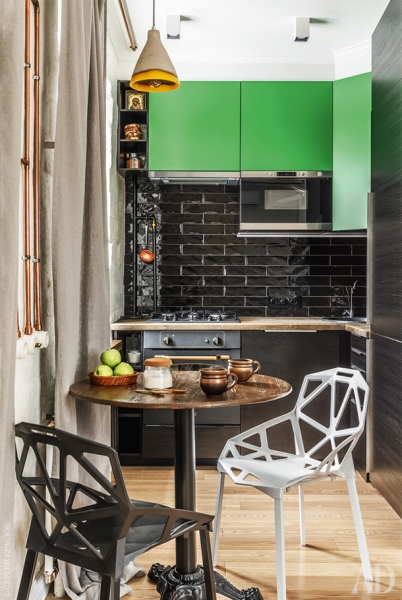 Эта кухня находится в московской квартире дизайнеров Виктории и Михаила Уткиных. Изначально хозяева хотели сделать зону готовки темной, чтобы она растворялась в интерьере. Но потом решили добавить в интерьер цвета и сделали верхние шкафчики зелеными, чтобы они гармонировали с деревьями за окном. Обеденный стол Михаил сделал своими руками — размер столешницы точно выверен, чтобы он встал ровно на отведенное ему место в простенке между окнами.