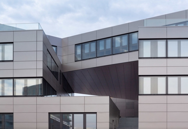 Отделка здания более чем лаконична — металлический фасад покрыт медными пластинами теплого оттенка. Они придают зданию строгости, но в то же время не создают впечатление типичного медицинского учреждения.