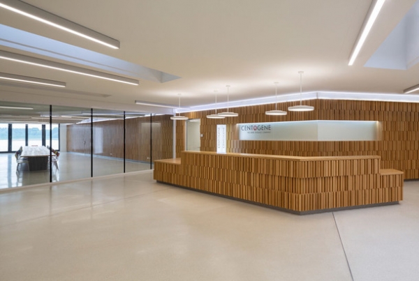 Здание состоит из ступенчатой конструкции: первый этаж является своеобразным подиумом, на котором выстраивается несколько уровней разного размера. Верхний этаж сверху напоминает X-образную форму, что является отсылкой к генам, с которым тесно работают сотрудники центра.