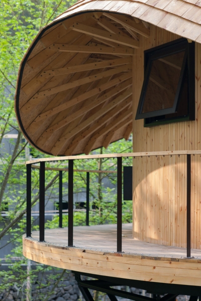 Восьмиметровое сооружение состоит из нескольких уровней, поэтому издалека напоминает домик на дереве. Часть террасы выступает и создает ощущение, что она парит над землей.