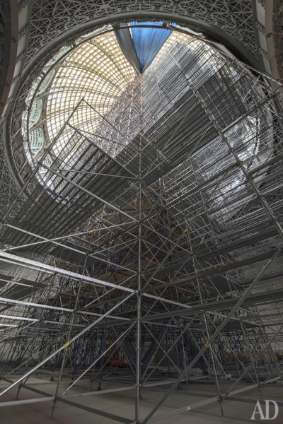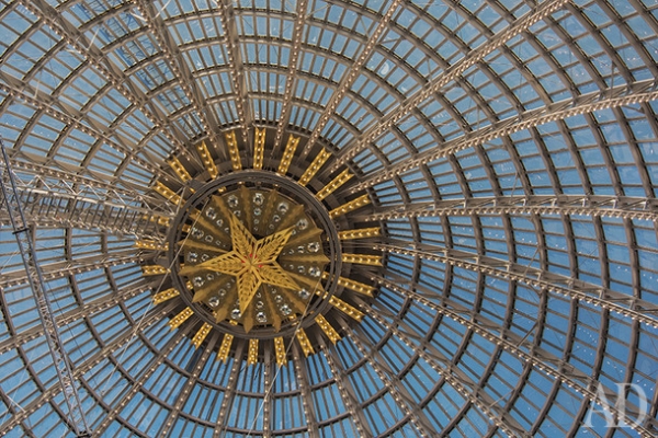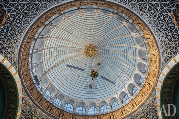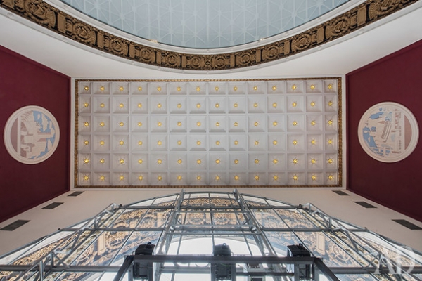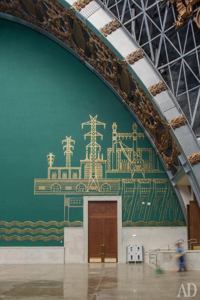 Люстру диаметром более 4 м восстановили по архивным чертежам и фотографиям: она украшала купольный зал “Космоса” с 1954 года до начала 1970-х годов, а затем была демонтирована и утеряна. Был восстановлен также один из самых ярких элементов архитектурного декора — панно из золотой смальты на сочно-зеленых стенах купольного зала, посвященное механизации и электрификации сельского хозяйства. Его следы были утеряны в 1970-е. Реставраторы также нашли под фанерными щитами металлические гербы советских республик и символы разных отраслей сельского хозяйства под куполом и вернули их к жизни.