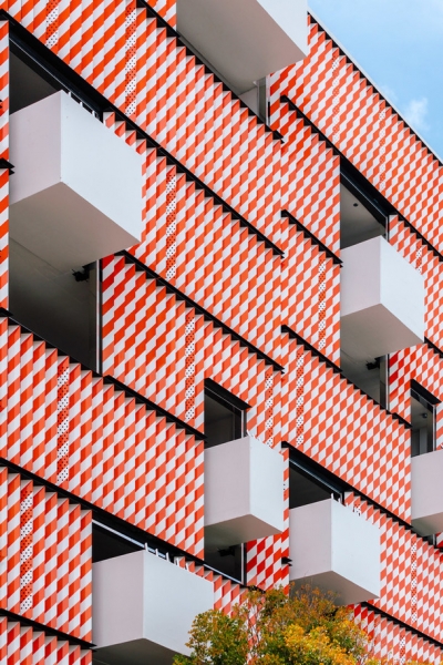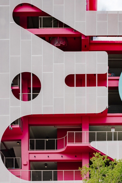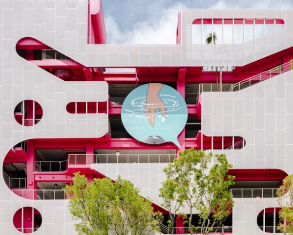 Вышло, как и можно было предположить, невероятно эклектично, ярко и весело. WORKac сделали фасад, который назвали “Муравьиной фермой”, — перфорации на белом фасаде напоминают ходы в муравейнике, в которых кипит непонятная внешне, но какая-то очень активная жизнь. В роли муравьев выступают посетители парковки. Эта часть отлично сочетается с “Объятиями и поцелуями” от J. Mayer H. — фасадом с разноцветными деталями, складывающимися на манер пазла.
