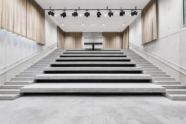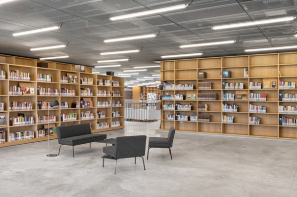 Центральное место академии — это, конечно, библиотека. Она имеет несколько уровней, соединенных между собой лестницами. Бетонные опоры и лестницы не выглядят грубо, поскольку уюта и тепла добавляет дерево.
