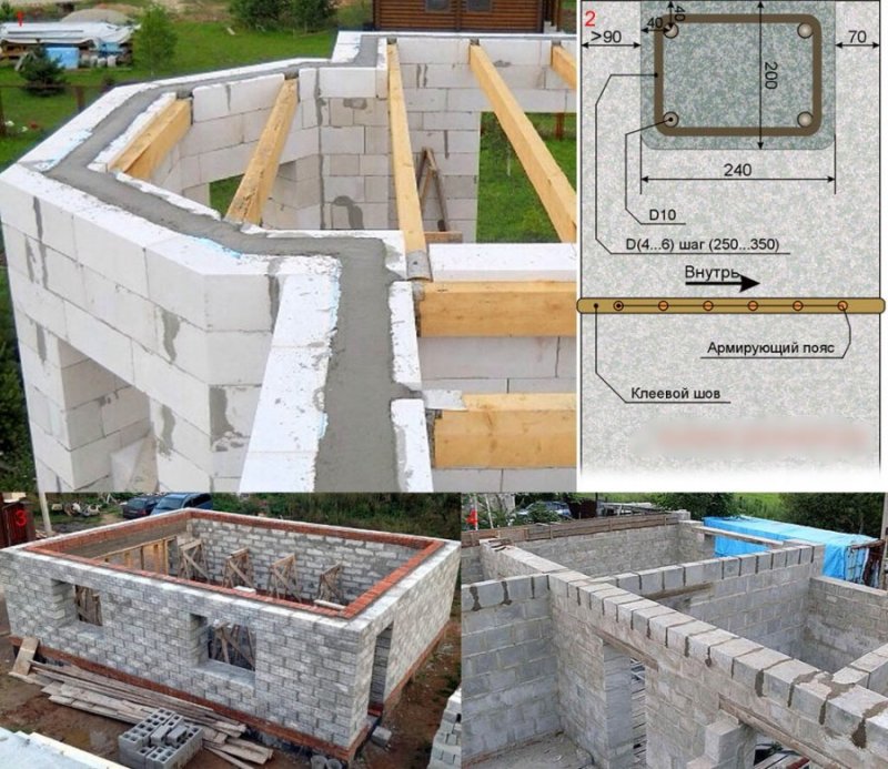 Чтобы стены были горизонтально ровными, первые три ряда укладывайте кирпичом. Следующие ряды уже состоят из пеноблоков с шириной шва до 5 мм. Перед укладкой оконных блоков, снова три ряда должны быть кирпичными. Последние три уровня стен также выполняются из кирпича, на них кладутся плиты перекрытия.