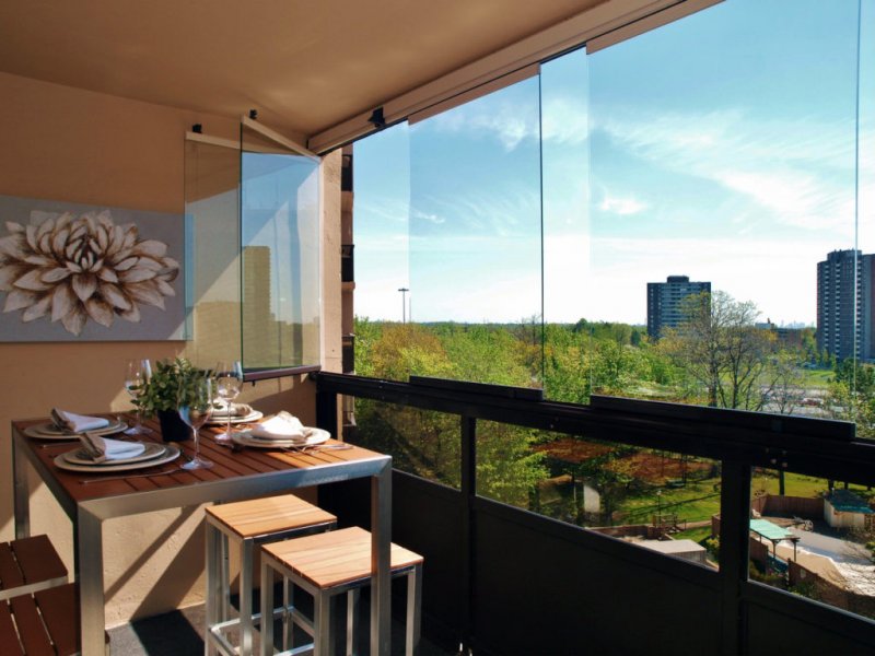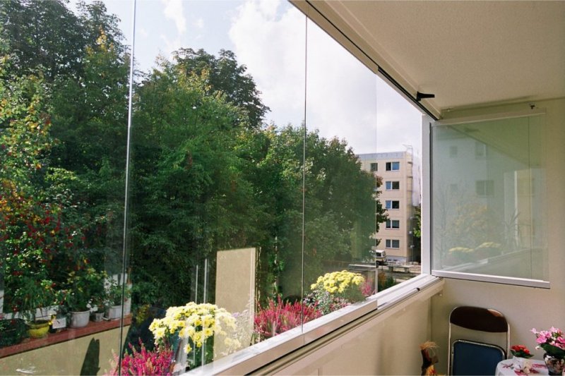 Складное безрамное остекление балконов, террас, веранды относится к универсальным системам, позволяет открывать застекленную область в обе стороны, складываясь по принципу книжки. Благодаря отсутствию рам конструкция подходит для помещений с любой формой и архитектурой – Г-образных, овальных, радиусных и П-образных.