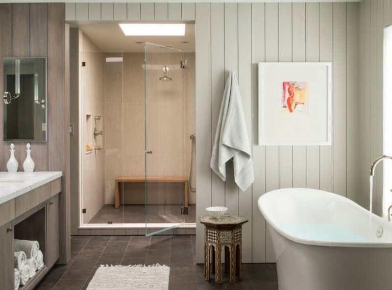 Облицовка стен, потолков стеклом – яркое, современное решение. Такая отделка используется в интерьерах хай-тек, лофт, минимализм, футуризм. Стекло выбирается тонированное, матовое, прозрачное. Поверхность специального стекла для ванной идеально ровная, может иметь фотопечать в виде рисунков, орнаментов, целых картин, преимущественно с морской, лесной, растительной тематикой. К стенам детали крепятся точно так же как и зеркала. На целую стенку достаточно одного-двух, максимум трех стекол – чем меньше стыков, тем меньше вероятность появления грибка, грязи, тем проще уход за данными поверхностями.