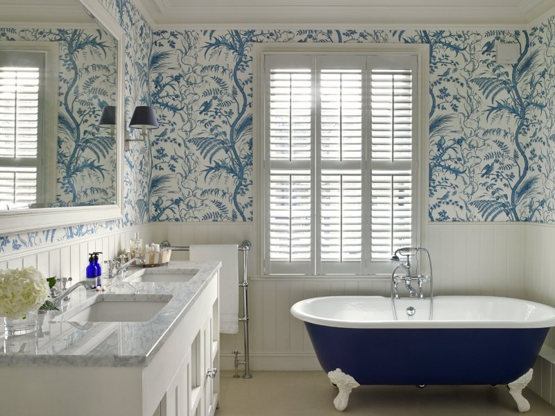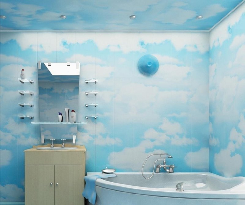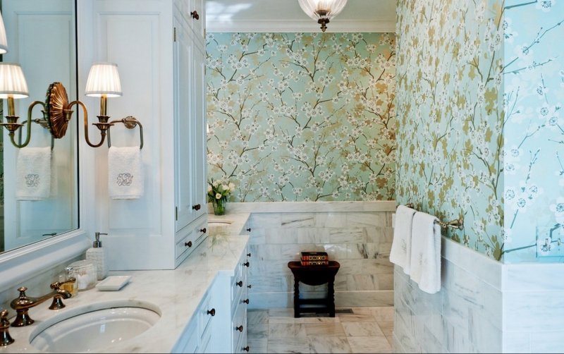 В тесной ванной комнате объемные стеновые панели или плитку заменяют тонкими обоями. Плюсы такой отделки: