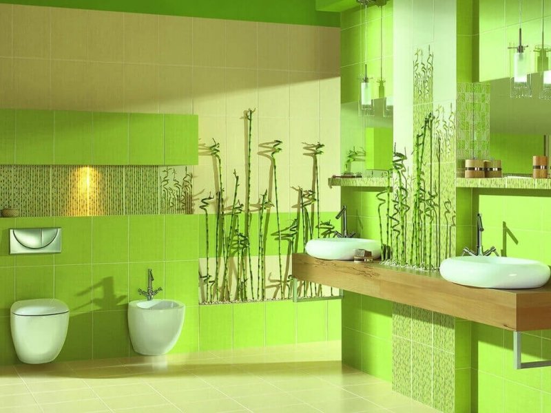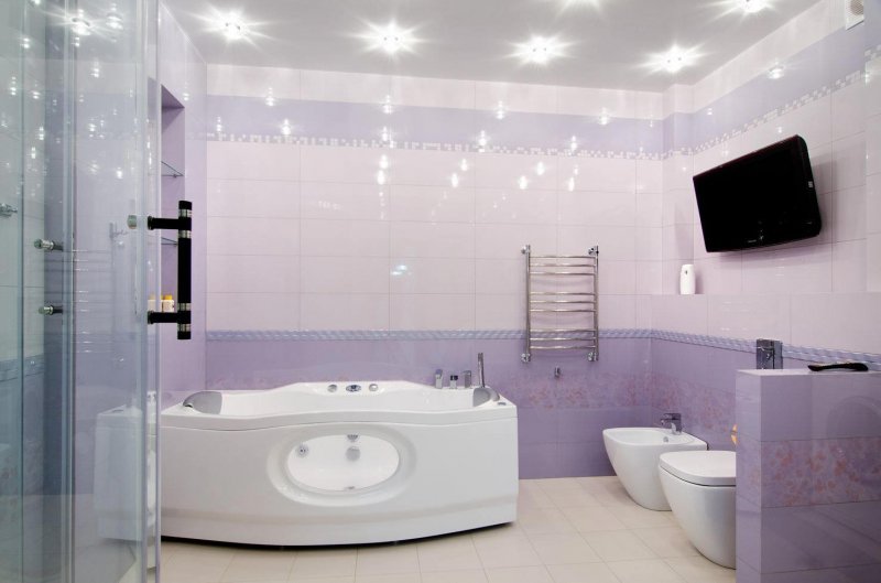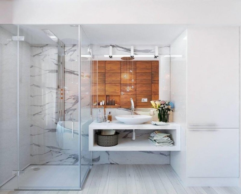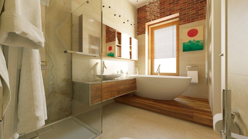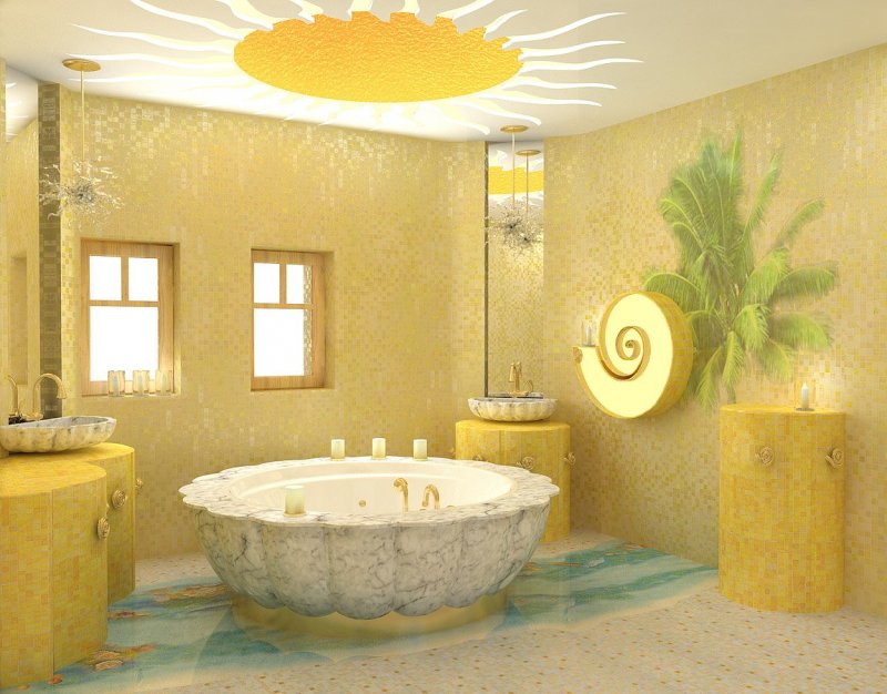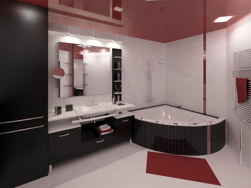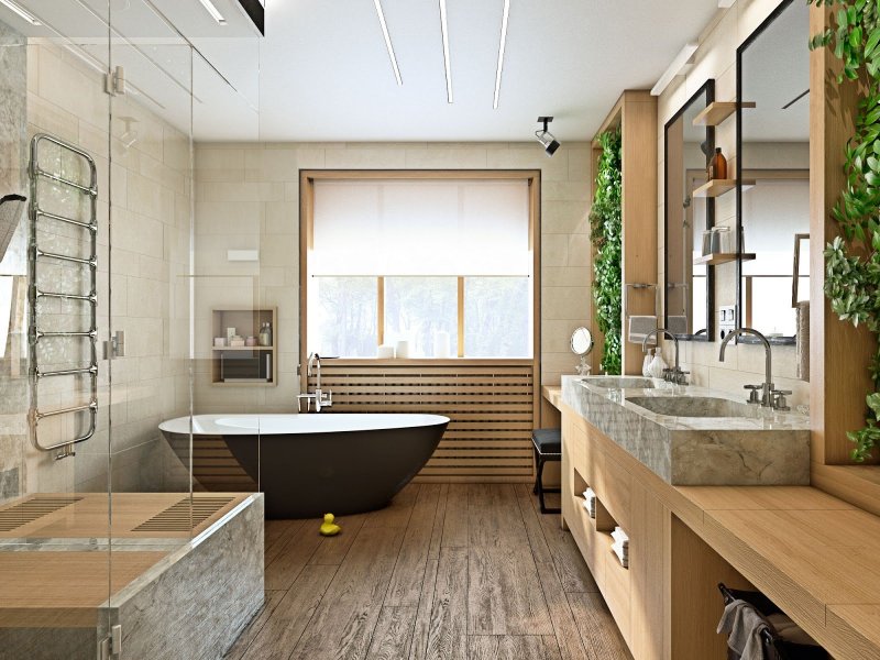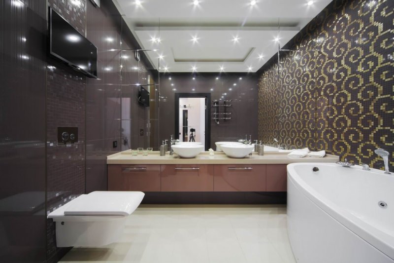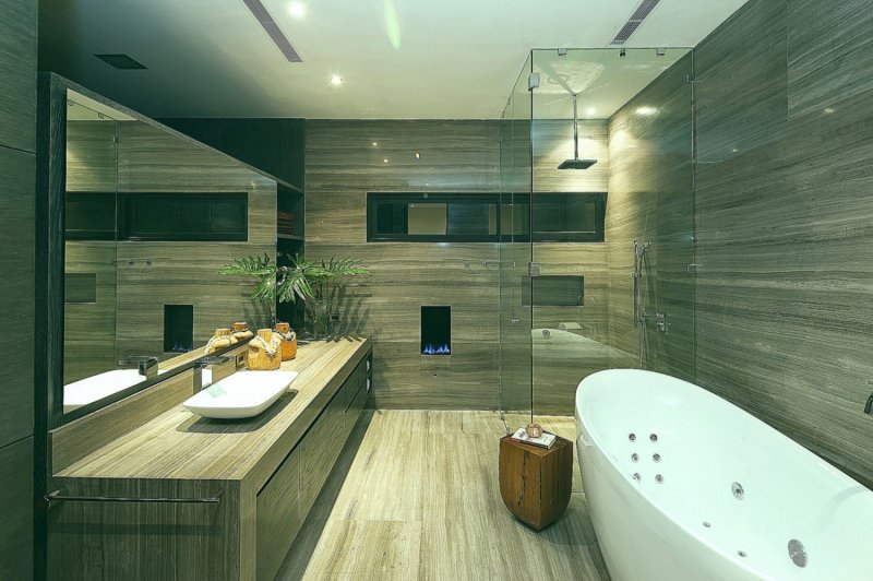 Оптимально подойдет керамическая плитка – она долговечна, легко моется, различные виды стеновых панелей из дерева, пластика, камня подбираются под конкретный интерьерный замысел. Стеклообои весьма практичны, но если их предполагается красить, краска подбирается устойчивая к постоянному воздействию влаги. Бюджетный вариант – водостойкая декоративная штукатурка, более дорогостоящий – мозаика. Пол выполняется из крупной керамической плитки, водостойкого ламината, реже – природного камня. Допустимы подиумы, пьедесталы под отдельные сантехнические элементы. Потолок делается натяжным, подвесным, в том числе многоуровневым либо просто окрашивается стойкой краской.