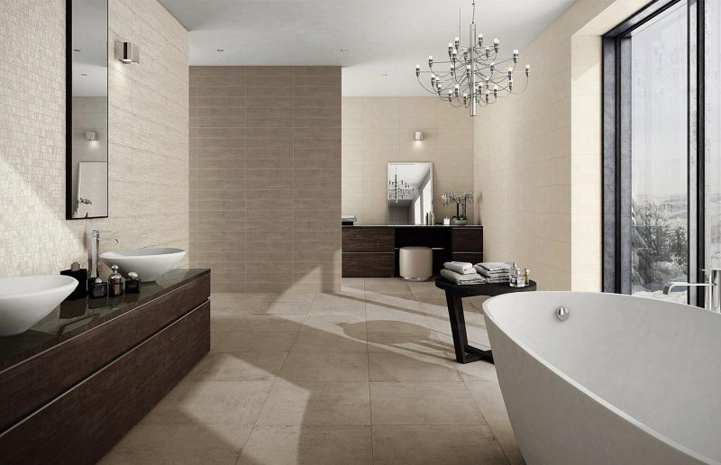 Расцветка просторной ванной зависит от наличия окна, а также индивидуальных предпочтений хозяев жилища. Приемы, расширяющие пространство, здесь излишни – места вполне достаточно. Помещение, расположенное в глубине квартиры, оформляют теплыми тонами, комнату с окошком на улицу – более холодными.