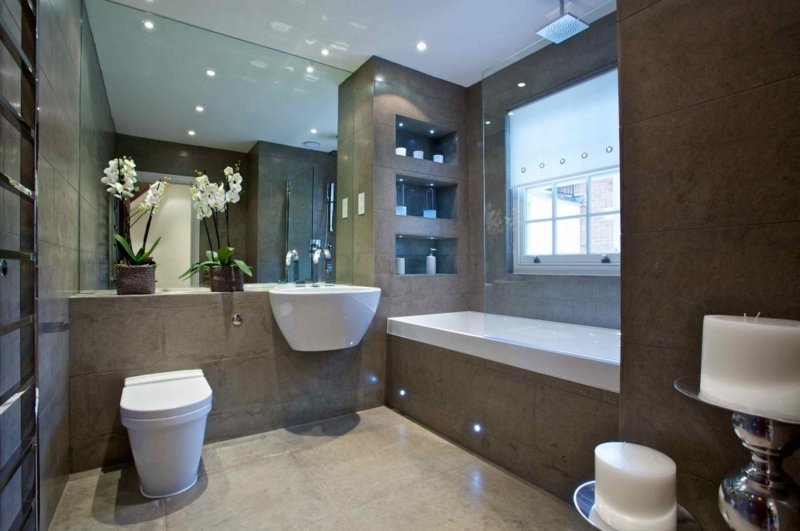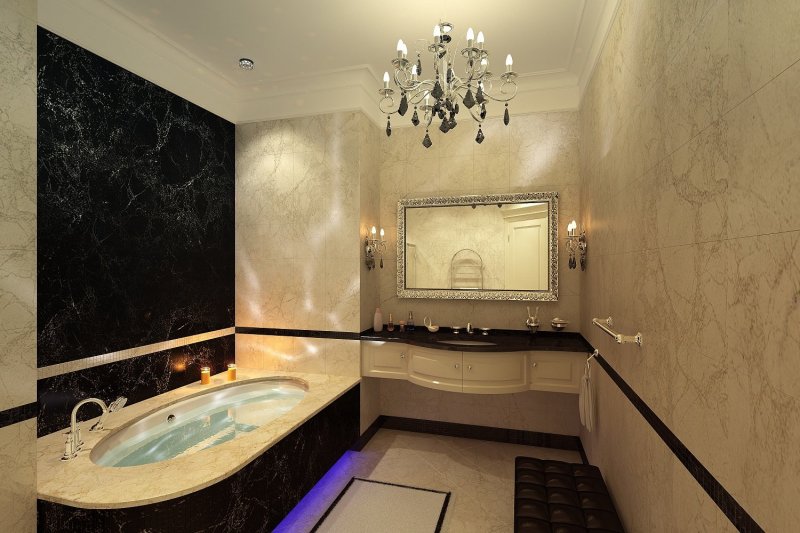 Осветительные приборы оснащаются защитой от влаги или монтируются вдали от смесителей. В идеале своя лампа монтируется над каждым сантехническим прибором плюс основной потолочный светильник. Для современных, минималистичных интерьеров подойдет встроенное точечное освещение, а классическому, рококо, барокко – хрустальные, многорожковые люстры, замысловатые бра, стилизованные под факелы. Помещение стиля лофт, хай-тек оснащается гримировочным зеркалом с контурной подсветкой, декоративную светодиодную ленту пускают по верху, низу мебели.